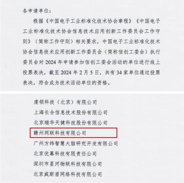 中國(guó)電子工業(yè)標(biāo)準(zhǔn)化技術(shù)協(xié)會(huì)信息技術(shù)應(yīng)用創(chuàng)新工作委員會(huì)(簡(jiǎn)稱信創(chuàng)工委會(huì))執(zhí)行委員會(huì)通過贛州網(wǎng)聯(lián)科技有限公司申請(qǐng),正式成為信創(chuàng)工委會(huì)技術(shù)活動(dòng)單位。